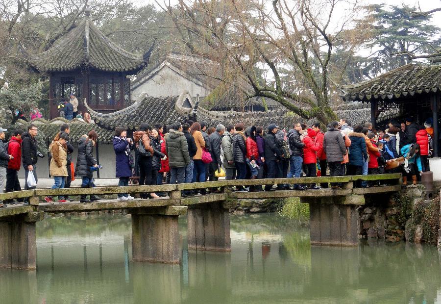 Tourists watch the opera performance at Shantang Street, a scenic spot in Suzhou, east China's Jiangsu Province, Feb. 10, 2013. The number of tourists during the week-long Spring Festival holiday topped 203 million across the country, up 15.1 percent from the same period last year, according to the latest statistics by the National Tourism Administration. The Spring Festival, or the Chinese Lunar New Year, fell on Feb. 10 this year. |