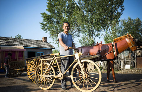 Wei Guirong drives his granddaughters from kindergarten on his home-made three-wheeled vehicle in Luorong county, Liuzhou city of Guangxi Zhuang autonomous region, on May 19.