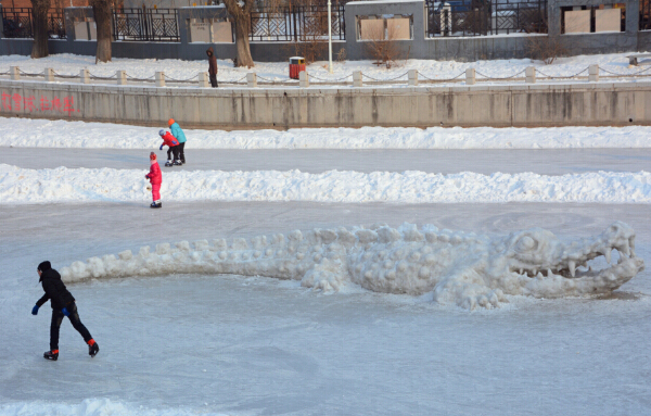 Visitors skate around the large crocodile snow sculpture on the frozen lake in Jilin city, Northeast China’s Jilin province, on Jan 4, 2015. [Photo by Wang Mingming/Asianewsphoto] |