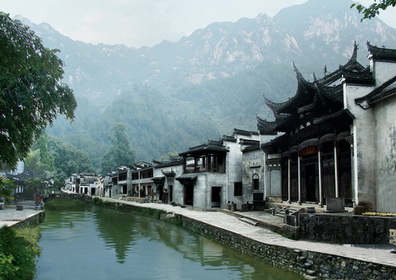 Along the Longchuan Creek lie rows of homes facing water with hills in back, which is typical of ancient Huizhou-style village complexes.