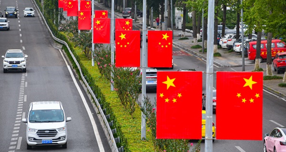 Chongqing's main areas are decorated with national flags to celebrate National Day.