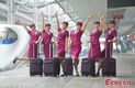 Stewardesses dressed in new summer uniforms pose on June 26, 2014 at a railway station in Chongqing municipality.