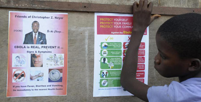 A poster, among those being distributed by UNICEF, bears information and illustrations on the symptoms of Ebola virus disease (EVD) and best practices to help prevent its spread in this 2014 UNICEF handout photo.
