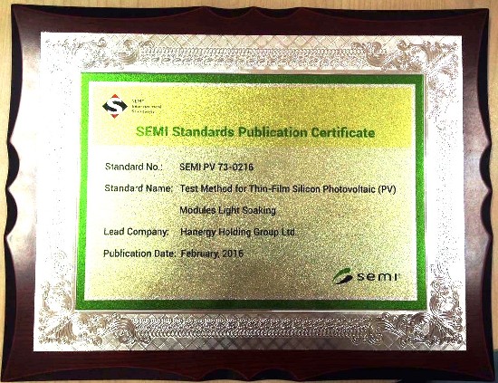 近日,由漢能控股集團(tuán)有限公司(以下簡稱漢能控股)主導(dǎo)編制的《硅基薄膜光伏組件光致衰退測試方法》(SEMI PV 73-0216)正式發(fā)布,并獲得SEMI頒發(fā)的標(biāo)準(zhǔn)證書。