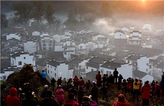 Early morning fog scenery of Shicheng village in East China's Wuyuan