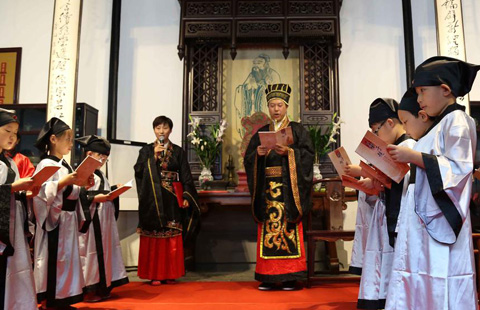 Children recite paragraphs of Standards for Students during a ceremony to mark the new semester at Donglin Academy in Wuxi, East China's Jiangsu province, Aug 27, 2016.