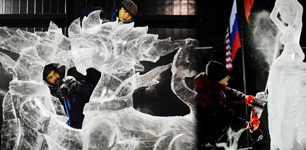 Carvers work on their ice sculpture pieces at the 26th Harbin International Ice Sculpture Competition in Harbin, Heilongjiang province, Jan 7, 2012. More than 20 teams from nine countries are taking part in the three-day event.