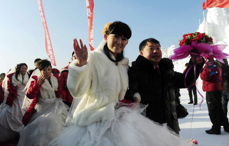 18 couples from Nigeria, Russia and China participated in a group wedding ceremony as part of the 28th Harbin International Ice and Snow Festival in Harbin, Heilongjiang province January 6, 2012.