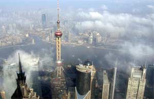 Fog shrouds tall buildings in the Pudong district of Shanghai, Feb 22, 2011. Advection fog occurs when moist air is blown over a cool surface. It is common when a warm front passes over an area with significant snow.