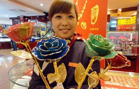 A store in Suzhou sells gold-plated roses to attract customers ahead of Valentine’s Day, Feb 9, 2012.