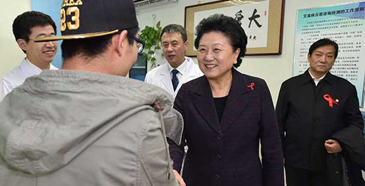 Vice-Premier Liu Yandong attends a symposium during an inspection of work on prevention and treatment of AIDS at the Center for Disease Control and Prevention of Shijingshan District in Beijing, Dec 1, 2015.
