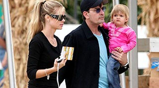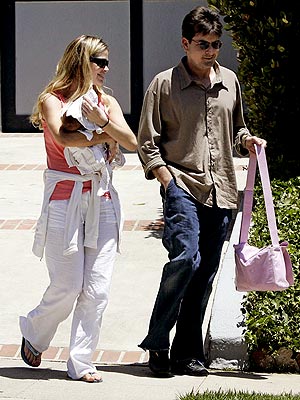 Mirroring each other's movements, Charlie Sheen and Denise Richards (with daughter Lola in L.A. in June) "are on equal footing," says Wood. Richards's body faces Sheen's – "she's saying, 'I'm with him.' " As for Sheen, Wood says, "It would be better if he was touching her in some way" – but admits, "It's good that he's holding the baby bag."