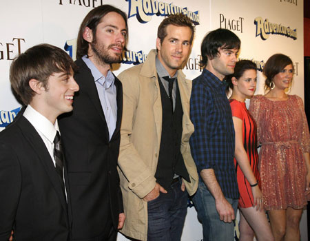 The cast of "Adventureland" Matt Bush, Martin Starr, Ryan Reynolds, Bill Hader, Kristen Stewart and Kristen Wiig (L-R) pose together at the movie's premiere at the Mann Chinese 6 Theater in Hollywood, California March 16, 2009. [Agencies]