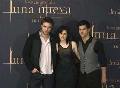 Actors Robert Pattinson (L), Kristen Stewart and Taylor Lautner (R) pose during a photocall to promote their latest film "The Twilight Saga: New Moon" in Madrid November 12, 2009. [Agencies]