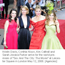 Actresses (L-R) Kristin Davis, Cynthia Nixon, Kim Cattrall and Sarah Jessica Parker arrive for the world premiere of ''Sex And The City: The Movie'' at Leicester Square in London May 12, 2008. [Agencies]
