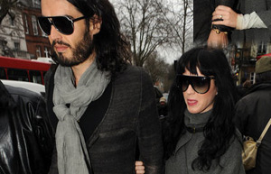 Russell Brand and Katy Perry sighted showing off her engagement ring whilst going for coffee and shopping on January 10, 2010 in London, England.