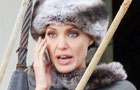 Angelina Jolie wears a Russian hat while talking on the phone during a break on the set of 'Salt' in NYC.
