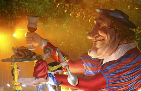A float which represents French actor Gerard Depardieu makes it way through the crowd during the Carnival parade in Nice February 15, 2014. The 130th Carnival of Nice runs to March 4 and celebrates the "King of Gastronomy". [Photo/Agencies] |