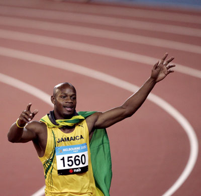champion Asafa Powell celebrates after winning the men's 100m final at the