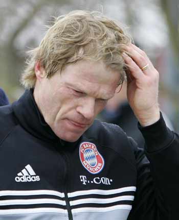Kahn as he touches his head after a training session in Munich January 6, 2006.