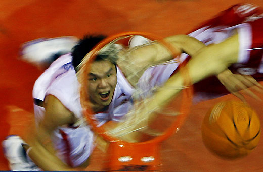 Guangdong forward Zhu Fangyu jumps for a rebound.