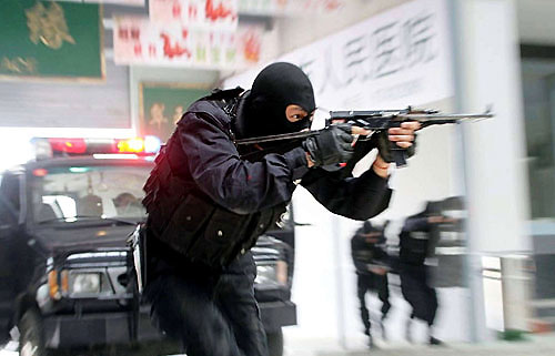 Chinese police special forces prepare to handle a hostage situation in a mockup of a street in Beijing as part of drills to highlight a program aimed at preparing Beijing's police forces for the 2008 Beijing Olympic Games. [Xinhua]