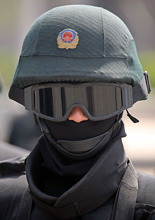 A masked member of a Chinese police SWAT team attends a ceremony to launch their Olympic security training programme in Beijing April 27, 2006. [Reuters]