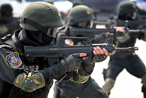 Masked members of a Chinese police SWAT team perform their skills at a ceremony to launch their Olympic security training programme in Beijing April 27, 2006. [Reuters]