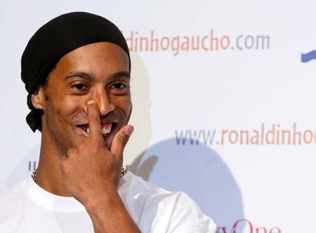 Barcelona's Brazilian soccer player Ronaldinho gestures during the presentation of his official website www.ronaldinhogaucho.com in Barcelona May 10, 2006.[Reuters]