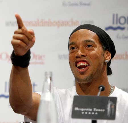 Barcelona's Brazilian soccer player Ronaldinho points during the presentation of his official website www.ronaldinhogaucho.com in Barcelona May 10, 2006.[Reuters]