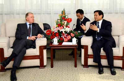 Cordial conversation between Liu Qi and Hein Verbruggen.