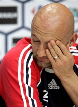 soccer team goalkeeper Fabien Barthez gestures during a press conference