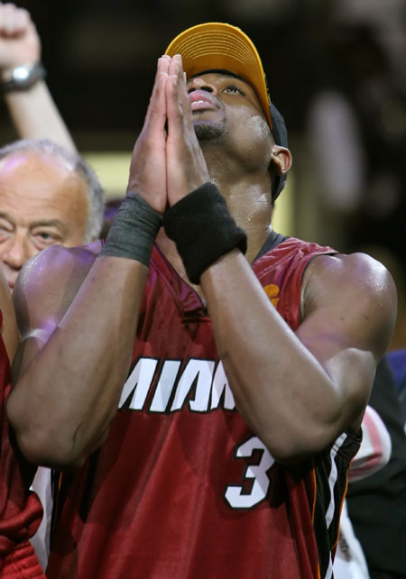 Miami Heat guard Dwyane Wade appears to pray after winning Game 6 of their NBA Finals basketball game against the Dallas Mavericks in Dallas, Texas, June 20, 2006. [Reuters]