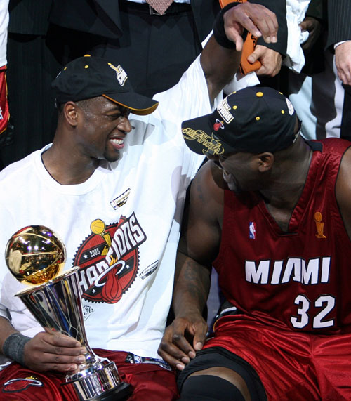 Miami Heat's Dwyane Wade and Shaquille O'Neal (R) celebrate after winning