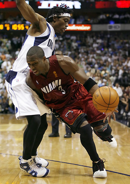 Miami Heat guard Dwyane Wade (R) dribbles around Dallas Mavericks guard