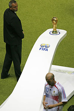 Zidane (R) walks off the pitch and past the World Cup Trophy after referee