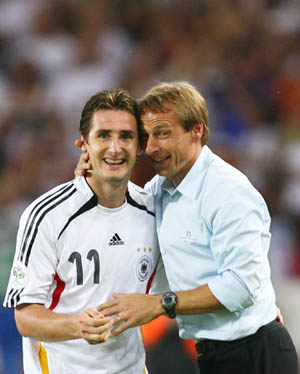Klose (L) and coach Juergen Klinsmann smile after Klose's substitution