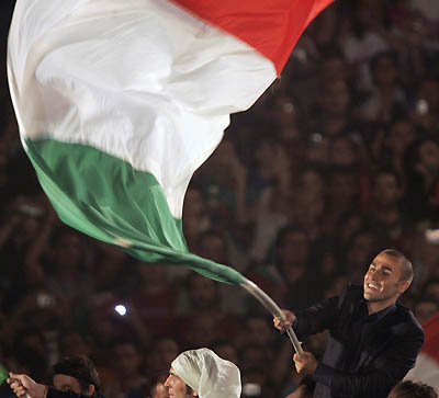 soccer team captain Fabio Cannavaro waves the Italian flag as the team is