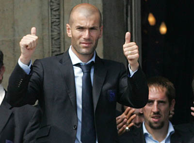 Zidane and player Franck Ribery (R) appear before supporters on the