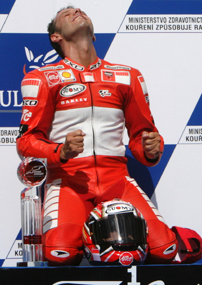 Ducati MotoGP rider Loris Capirossi of Italy kneels on the podium after winning the Czech Grand Prix at Masaryk's circuit in Brno August 20, 2006. [Reuters]
