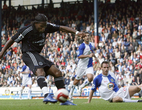 Chelsea's Didier Drogba (L) scores as Blackburn