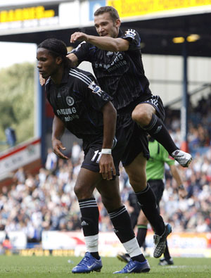 Chelsea's Didier Drogba (L) celebrates his goal against Blackburn Rovers with Andriy Shevchenko (R) during their English Premier League soccer match at Ewood Park in Blackburn, northern England, August 27, 2006. [Reuters]