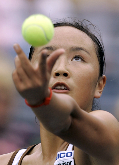 China's Peng Shuai serves to Switzerland's Martina Hingis during their match at the U.S. Open tennis tournament in New York, August 30, 2006.[Reuters]