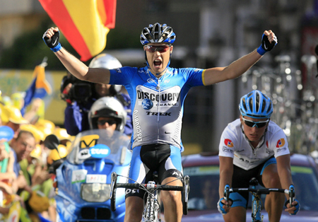 Discovery Channel's Tom Danielson (C) celebrates as he cycles past the finish