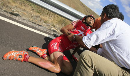 after a crash during the 16th stage of the Tour of Spain cycling race between