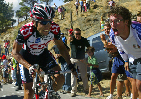 CSC's Carlos Sastre is cheered on by fans during the 17th stage of the Tour of Spain cycling race between Adra and Granada September 13, 2006. [Reuters]