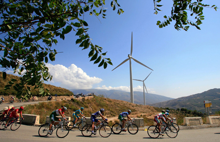 A group of riders cycle past wind turbines during the 17th stage of the Tour of Spain cycling race between Adra and Granada September 13, 2006. [Reuters]