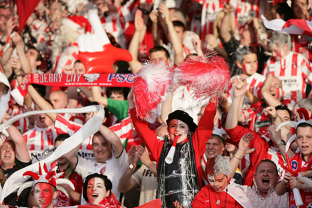 Derry City fans cheer during the UEFA Cup first round soccer match between Derry City and Paris St. Germain in Derry, Northern Ireland September 14, 2006. [Reuters]