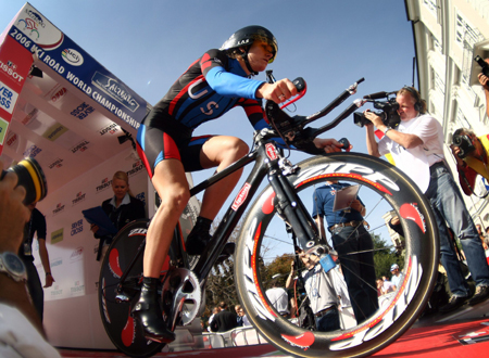Kristin Armstrong of the U.S. starts to win the women's individual time trial at the World Road Cycling Championships in Salzburg, September 20, 2006.[Reuters]
