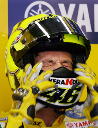 Yamaha's MotoGP rider Valentino Rossi of Italy wears his helmet in the pit